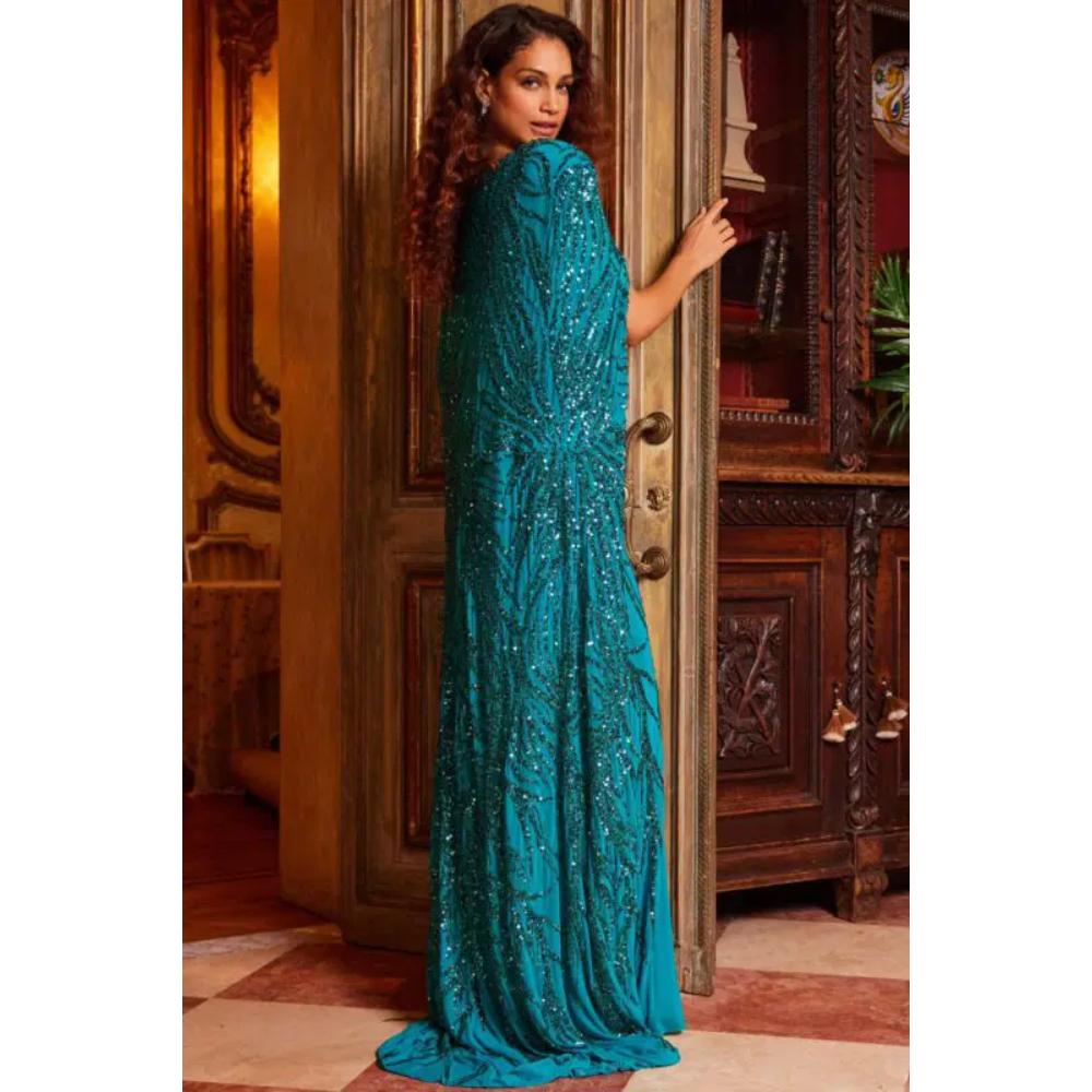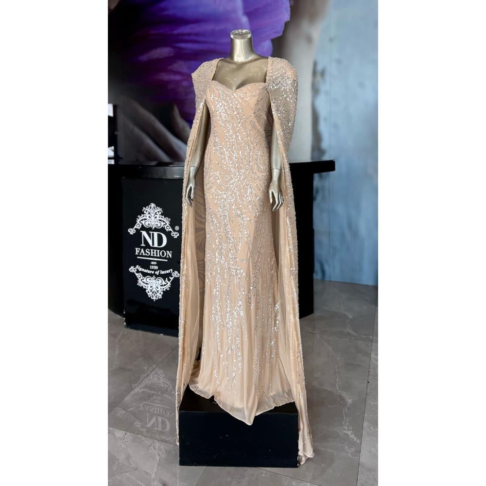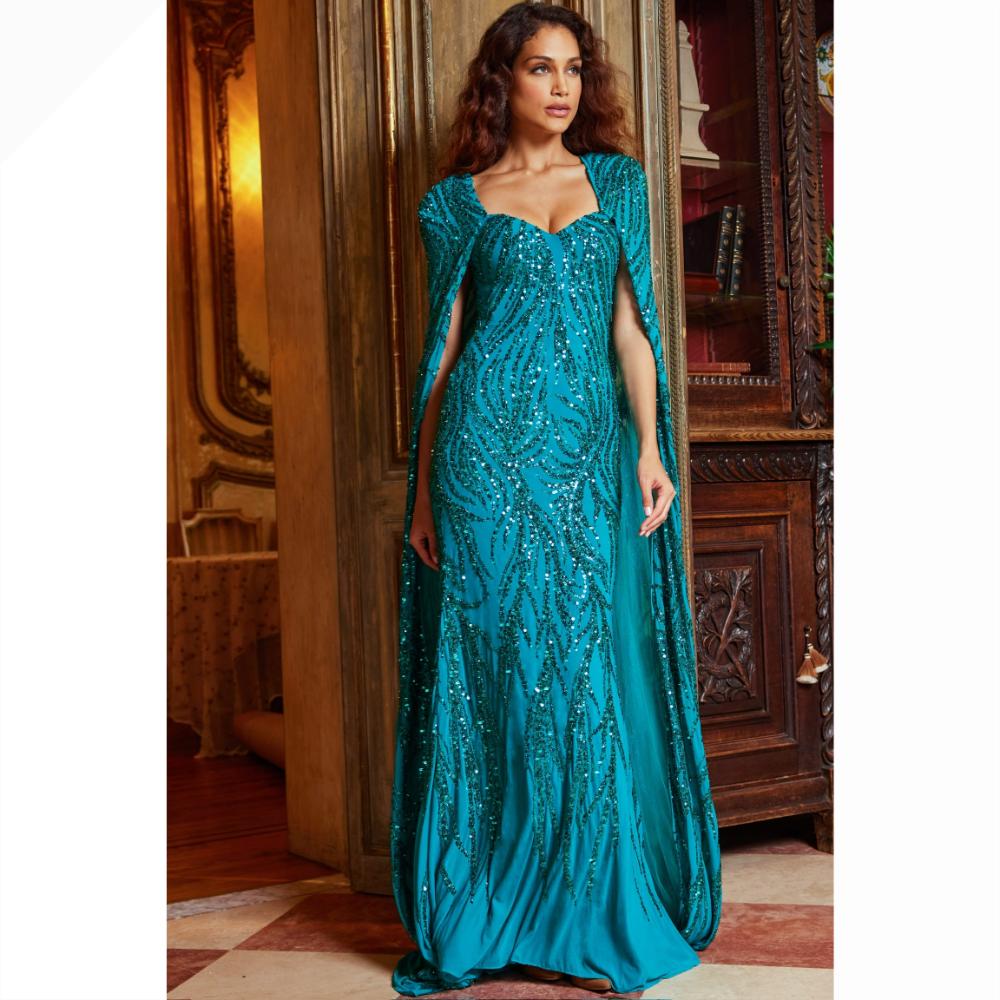 فستان سهرة طويل مزين بنقشة الطاووس من جوفاني 23891، تحفة فنية رائعة مصممة لتتألقي في أي مناسبة رسمية. يتميز هذا الفستان الفاخر بتصميم طويل يصل إلى الأرض، ينساب بأناقة ليمنحكِ إطلالة ساحرة. يُبرز الفستان تفاصيل خرزية دقيقة وتطريزات لامعة من الترتر، مما يضفي عليه لمسة من التألق والرقي. القماش مصنوع من الشيفون عالي الجودة، مما يضمن الراحة والانسيابية. يتميز الفستان بفتحة رقبة على شكل قلب جذابة، تكملها أكمام طويلة بتصميم عباءة أنيقة تضفي عليه لمسة ملكية. مثالي للمناسبات الرسمية الكبرى،فهو مثال للفخامة والأناقة.