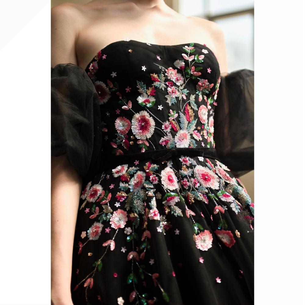 - تألقي بإطلالة تخطف الأنظار مع هذا الفستان الأسود المصنوع من التول الفاخر ، والمزيّن بتطريز يدوي دقيق من الزهور الملونة بأسلوب رومانسي أنيق. يتميّز بقصة أوف شولدر جذابة و أكمام منفوشه من التول الشفاف تضيف لمسة درامية ناعمه. التصميم المنسدل بانسيابية يعكس فخامة و أناقة لا مثيل لها. مثالي للمناسبات الخاصة وحفلات المساء.