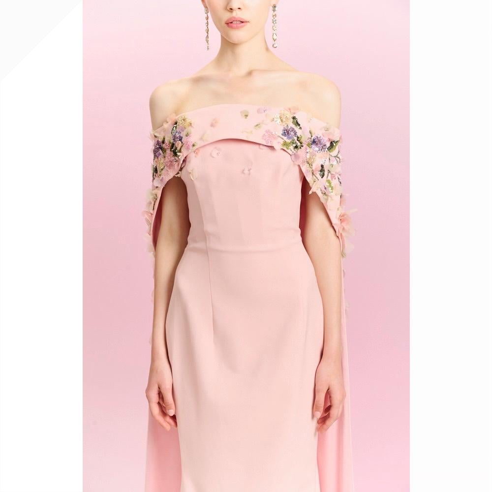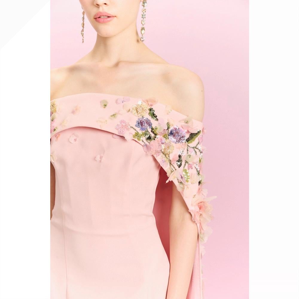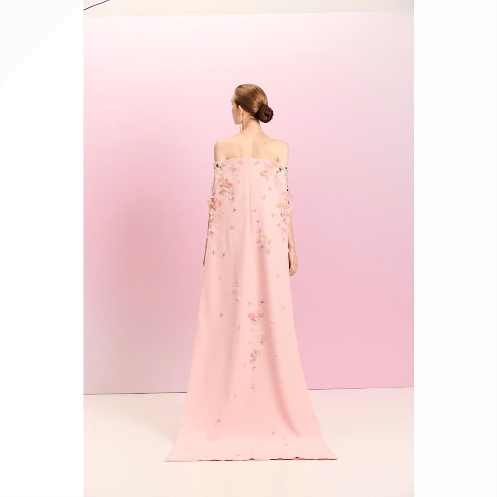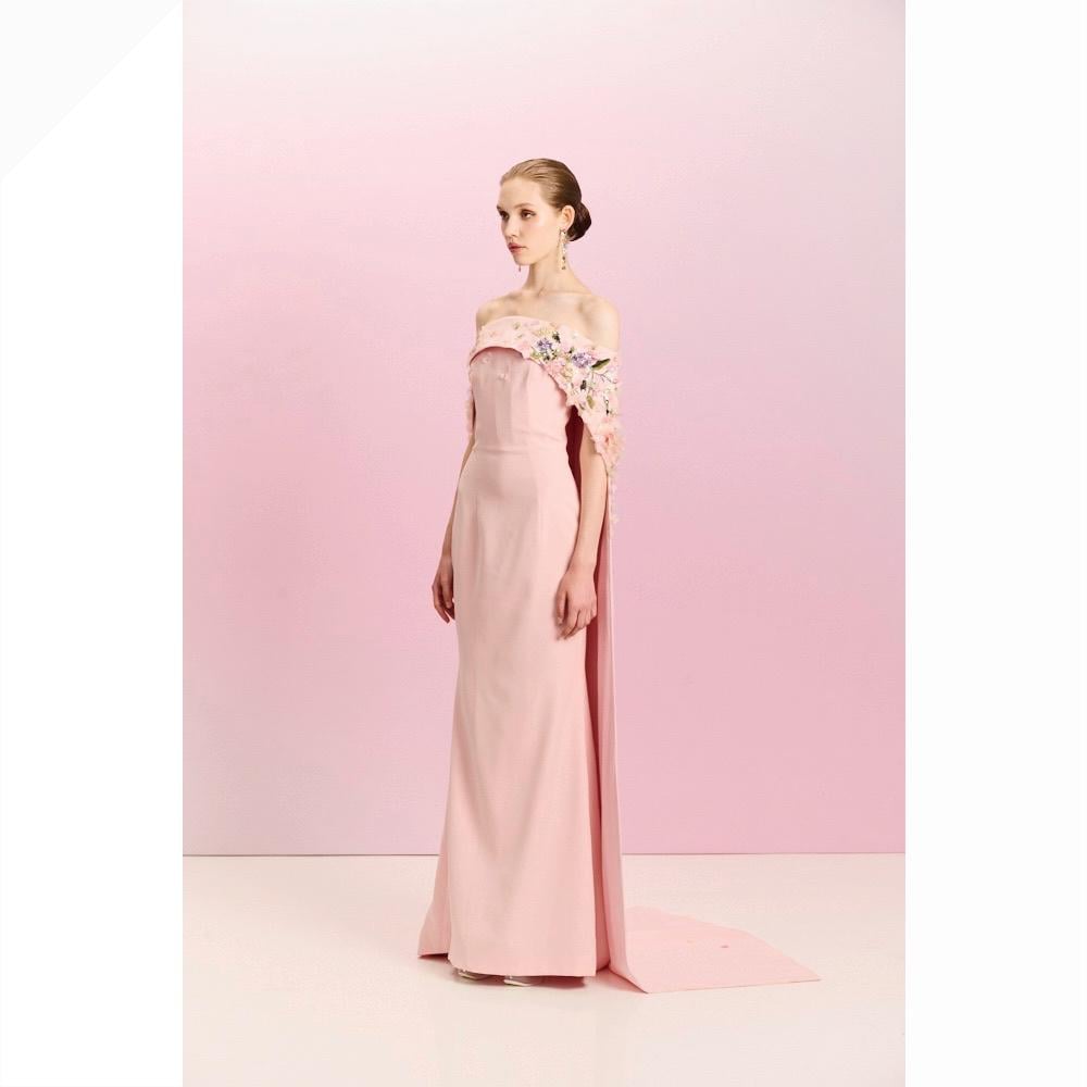 تألقي بإطلالة ساحرة مع هذا الفستان الوردي الراقي. بتصميم اوف شولدر يبرز الأكتاف برقي و أنوثة. يتميز الفستان بقماش كريب فاخر ، بقصة مستقيمة ناعمة تطيل القوام و تمنحه انسيابية جذابة. يزيّن الكتفين كيب مطرّز يدوياً بزهور ثلاثية الأبعاد ، يمتد الكيب المطرز من الأكتاف الى الأرض بانسيابية فاخرة ، تتناثر عليه الورود لتمنح إطلالتك لمسة حالمة و أنثوية.